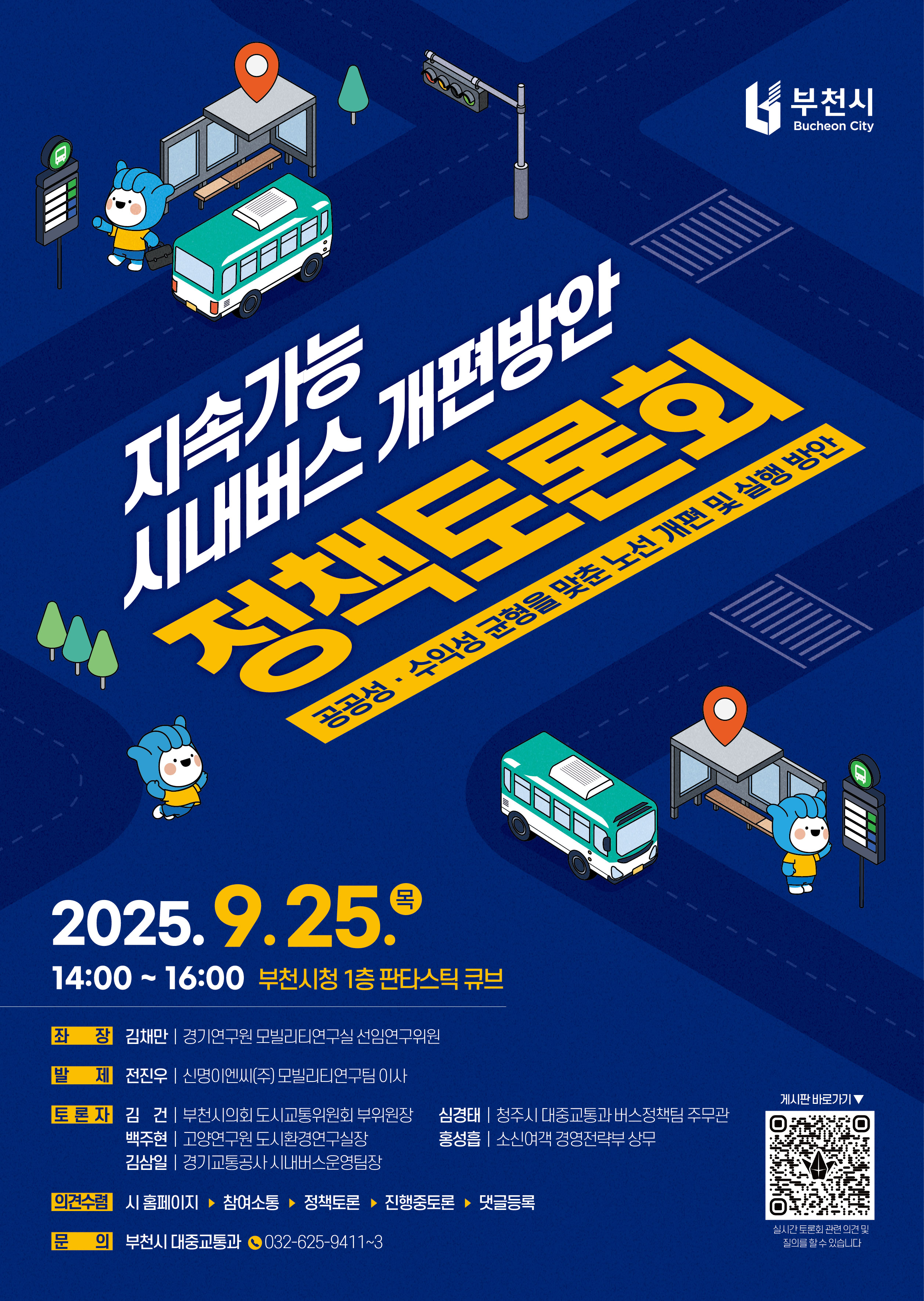 ○ 내용 : 부천시 시내버스 공공관리제에 대한 의견 제시 ○ 토론기간 : 2025. 9. 12.(금) ~ 9. 25.(목) ○ 참여방법 : 댓글로 의견 등록