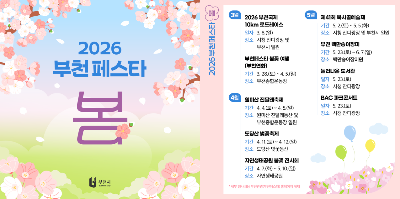BEST부천자연생태공원도심속 자연생태체험학습 공간BEST한국만화박물관한국만화 100년의 추억을 환상적으로 체험할 수 있는 공간BEST수피아체험, 볼거리, 즐길 거리가 가득한 테마공원추천부천문화둘레길길 위에서 만나는 역사·문화추천부천중앙공원소나무 숲이 장관을 이루는 시민들의 휴식공간추천상동호수공원자연과 함께 문화를 만들고 미래를 설계하는 시민참여공원축제부천주요축제꽃피는 봄에 열리는 봄꽃축제, 예술의 도시 부천에서 국제 및 다양한 축제를 개최하고 있습니다. 추천뻔뻔(fun fun)부천시티투어부천에서 만나는 특별한 여행!추천부천8경모바일 스탬프투어부천8경을 완주하여 모바일 스탬프 획득!체험관부천시의 다양한 기념관 및 박물관 체험!전통시장·특화거리전통시장 및 다양한 테마가 있는 마을숙박부천시 호텔 및 숙박업소관광맛집맛·위생·서비스가 우수한 지역특색 음식점