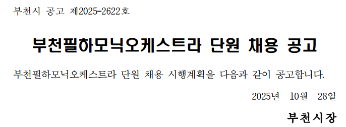"출처표시+상업적 이용금지+변경금지"부천시청이(가) 창작한 부천필하모닉오케스트라 단원 채용 공고 저작물은 공공누리 "출처표시+상업적 이용금지+변경금지" 조건에 따라 이용할 수 있습니다.