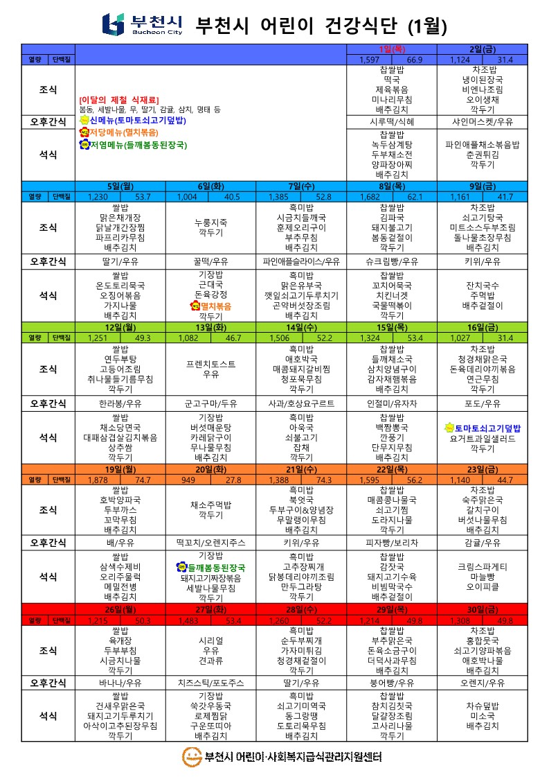 "출처표시+상업적 이용금지+변경금지"부천시청이(가) 창작한 2026년 1월 어린이 건강식단 저작물은 공공누리 "출처표시+상업적 이용금지+변경금지" 조건에 따라 이용할 수 있습니다.