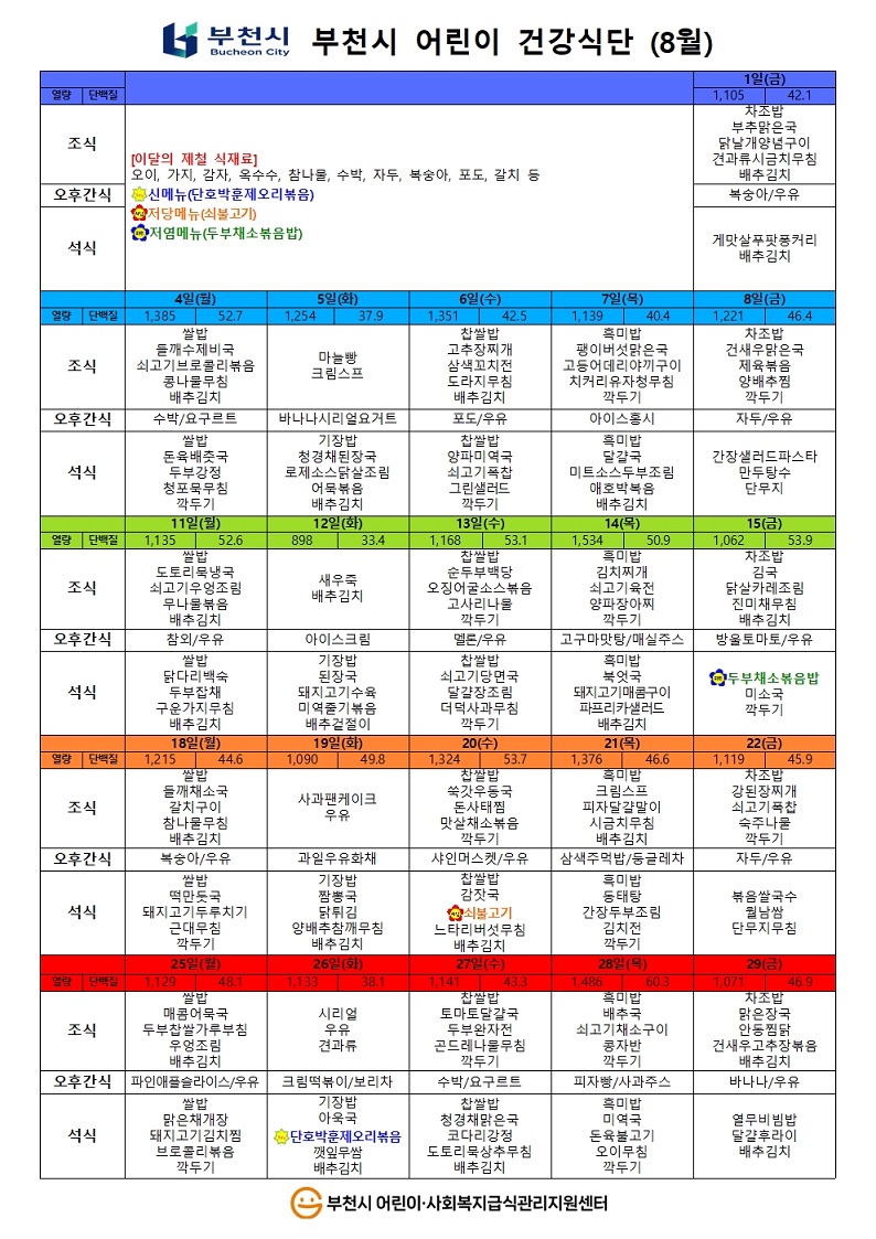 "출처표시+변경금지"부천시청이(가) 창작한 2025년 8월 어린이건강식단 저작물은 공공누리 "출처표시+변경금지" 조건에 따라 이용할 수 있습니다.