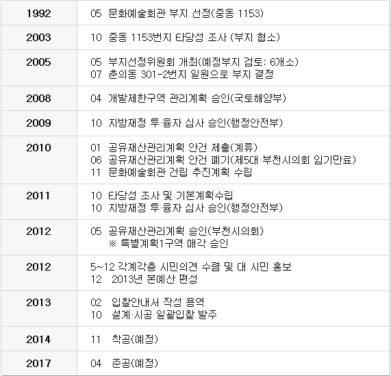 춘의동에 건립을 목표로 지난 2009년도 타당성 조사를 실시하고, 2010년도 1월, 부천시의회 제158회 임시회에 공유재산관리계획안을 상정하기에 이릅니다. 그러나 계류 후 제161회 때 까지 안건이 상정되지 않고 표류되다가 제5대 부천시의회 임기만료와 더불어 춘의동에 건립키로 했던 문화예술회관 건립계획은 자동폐기 되기에 이르렀던 것입니다.