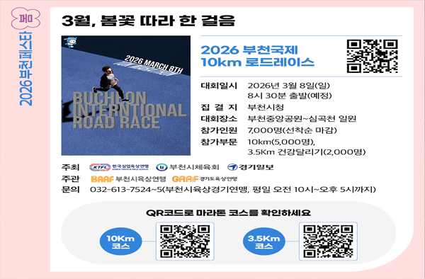 BEST부천자연생태공원도심속 자연생태체험학습 공간BEST한국만화박물관한국만화 100년의 추억을 환상적으로 체험할 수 있는 공간BEST수피아체험, 볼거리, 즐길 거리가 가득한 테마공원추천부천문화둘레길길 위에서 만나는 역사·문화추천부천중앙공원소나무 숲이 장관을 이루는 시민들의 휴식공간추천상동호수공원자연과 함께 문화를 만들고 미래를 설계하는 시민참여공원축제부천주요축제꽃피는 봄에 열리는 봄꽃축제, 예술의 도시 부천에서 국제 및 다양한 축제를 개최하고 있습니다. 추천뻔뻔(fun fun)부천시티투어부천에서 만나는 특별한 여행!추천부천8경모바일 스탬프투어부천8경을 완주하여 모바일 스탬프 획득!체험관부천시의 다양한 기념관 및 박물관 체험!전통시장·특화거리전통시장 및 다양한 테마가 있는 마을숙박부천시 호텔 및 숙박업소관광맛집맛·위생·서비스가 우수한 지역특색 음식점