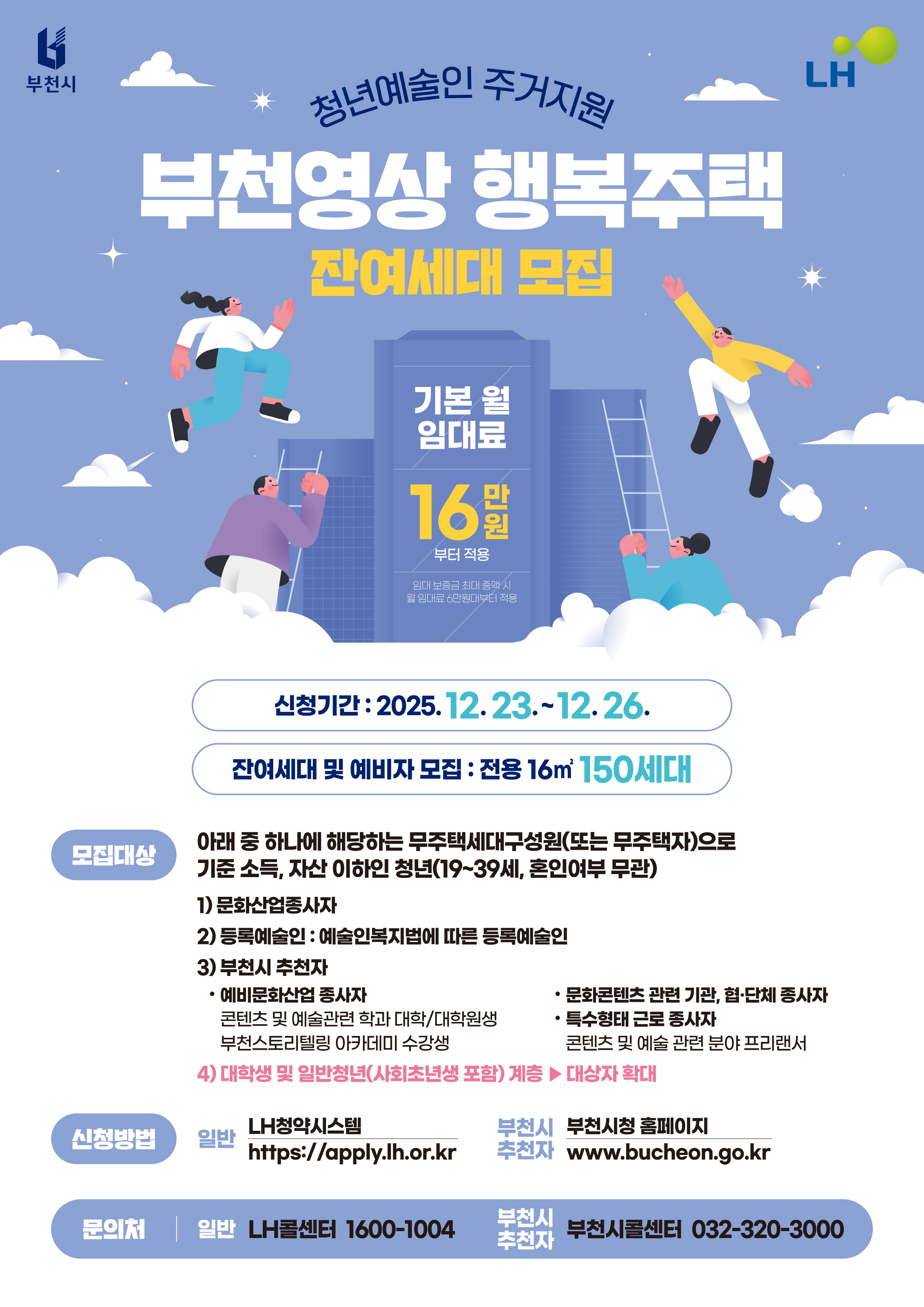 문화도시 부천의 활력제고와 청년 예술인의 안정적 주거를 지원하고자 우리 시는 LH와 함께 청년예술인주택 추가모집(5차)를 추진하고 있습니다. 우리 시 청년 예술인들의 많은 관심 바랍니다.