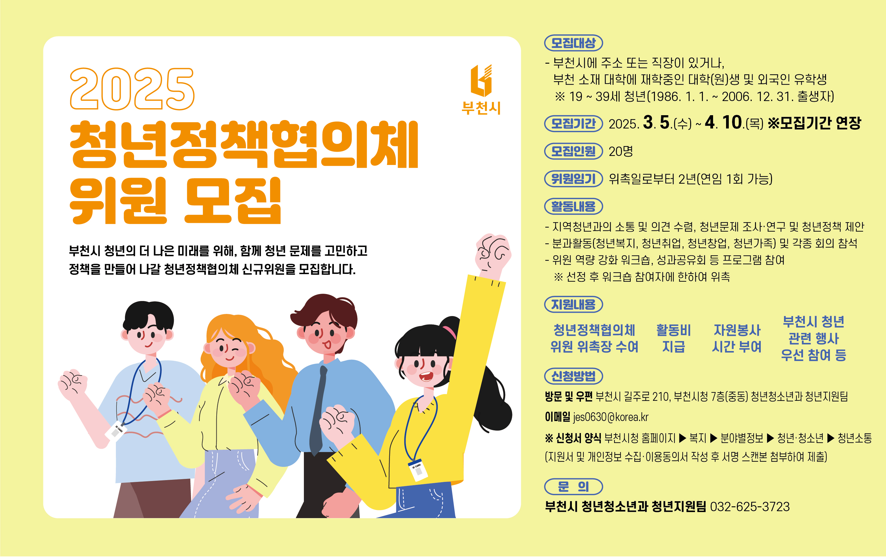 - 방문 및 우편 : 부천시 길주로 210, 부천시청 7층 청년청소년과 청년지원팀