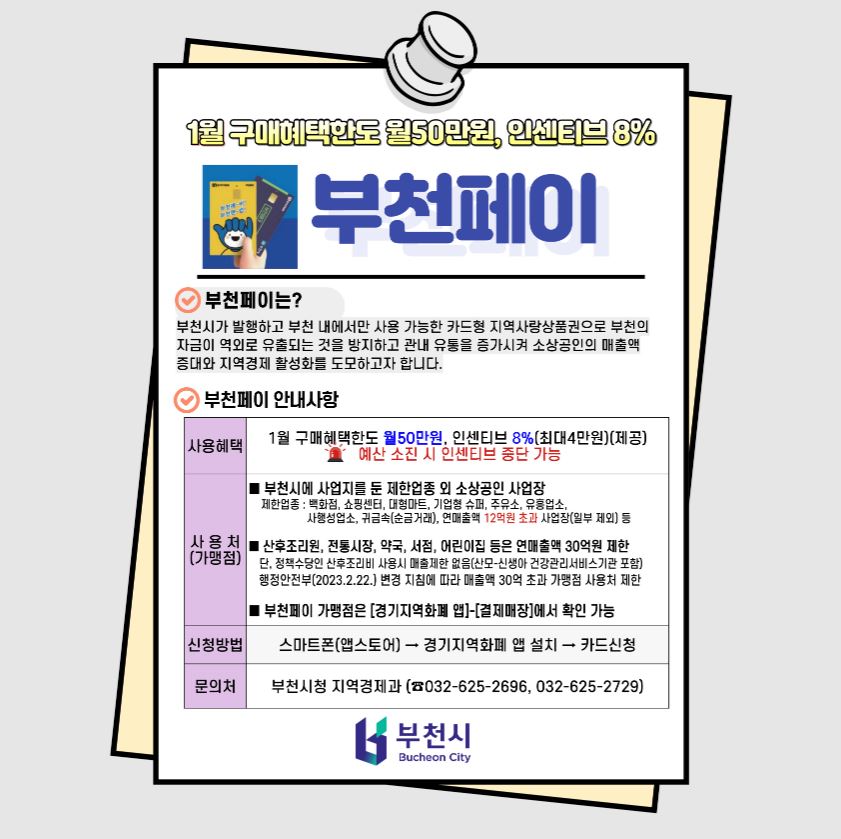‘부천페이’가 부천의 지역경제를 살리는 마중물의 역할을 기대합니다. 소상공인과 함께하는 ‘부천페이’에 시민여러분의 많은 관심과 사용을 바라며, 시민여러분과 함께 만들어가는 지역사랑상품권 ‘부천페이’가 되길 희망합니다. ‘부천페이’에 관한 모든 사항들을 지속적으로 알려드리도록 하겠습니다.